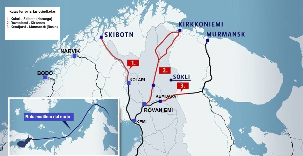 El cambio climático con la retirada parcial del hielo en el Ártico y las inversiones que se vienen realizando en la línea de alta velocidad Rail Baltica, a la que hace dos años le dedicamos una entrada en el Blog, han impulsado a los Ferrocarriles finlandeses a reactivar los proyectos para dar una salida marítima por el Ártico a su red con objeto de conectar con los puertos en esa zona y aprovechar la cada vez más transitada Ruta marítima del Ártico. Vamos a ver cual es el estado de esos proyectos, que en esquema podemos ver en este gráfico. Se trata de actuaciones a largo plazo pero cuyas líneas principales están ya en estudio.
