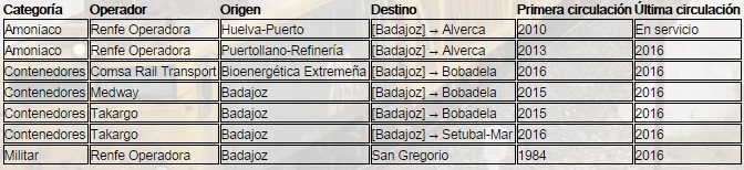 El cuadro de arriba muestra el histórico de circulaciones de mercantes por Badajoz y en el de abajo están las que han tenido continuidad en 2016, aunque varias de ellas han desaparecido en este último año (Fuente Spanish Rail Freight).